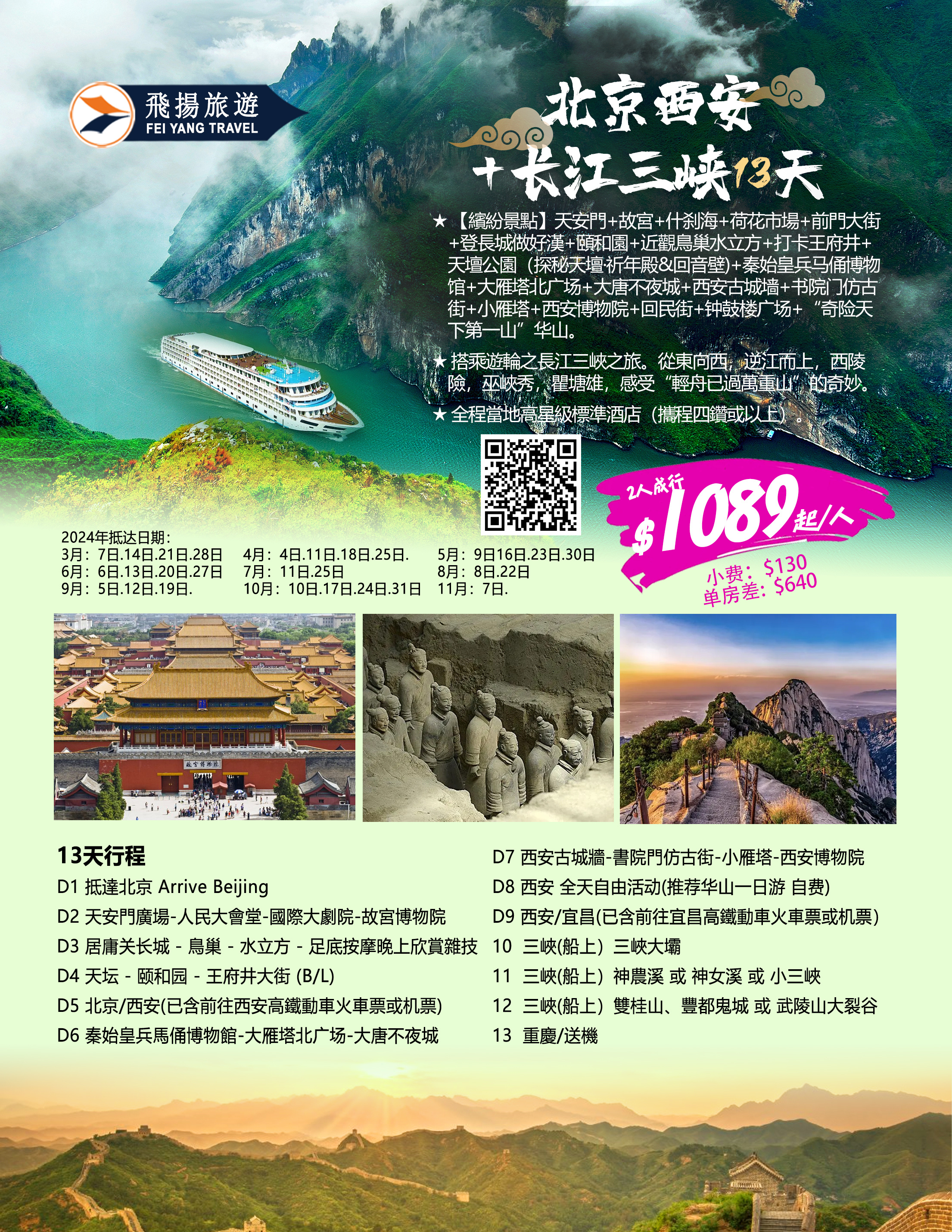 ★ 【繽紛景點】天安門+故宮+什刹海+荷花市場+前門大街+登長城做好漢+頤和園+近觀鳥巢水立方+打卡王府井+天壇公園(探秘天壇·祈年殿&回音壁)+秦始皇兵马俑博物馆+大雁塔北广场+大唐不夜城+西安古城墙+书院门仿古街+小雁塔+西安博物院+回民街+钟鼓楼广场+“奇险天下第一山”华山。
