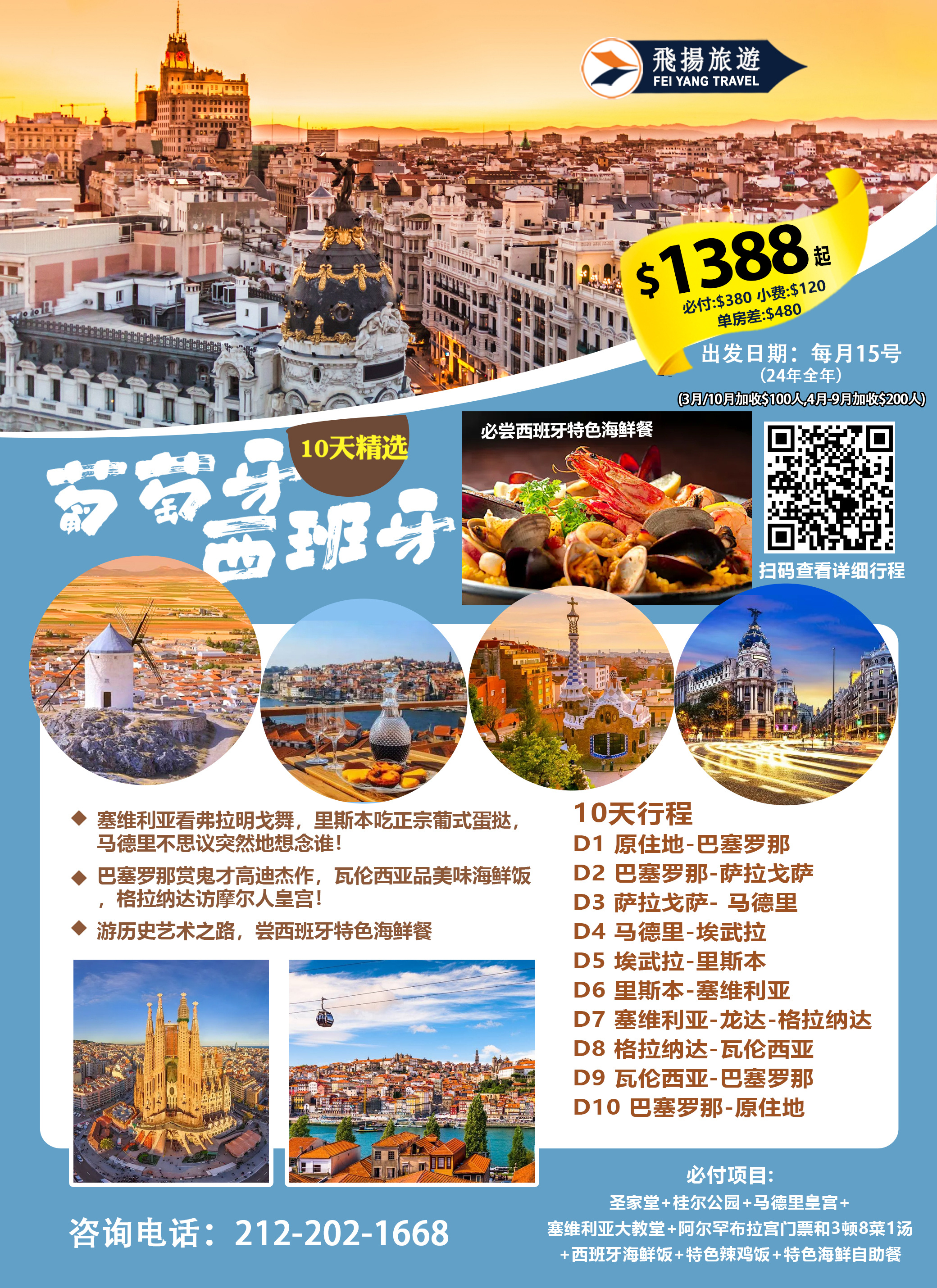 必付所含:圣家堂+桂尔公园+马德里皇宫+塞维利亚大教堂+阿尔罕布拉宫门票和 3 顿 8 菜 1 汤+西班牙海鲜饭+特色辣鸡饭+特色海鲜自助餐