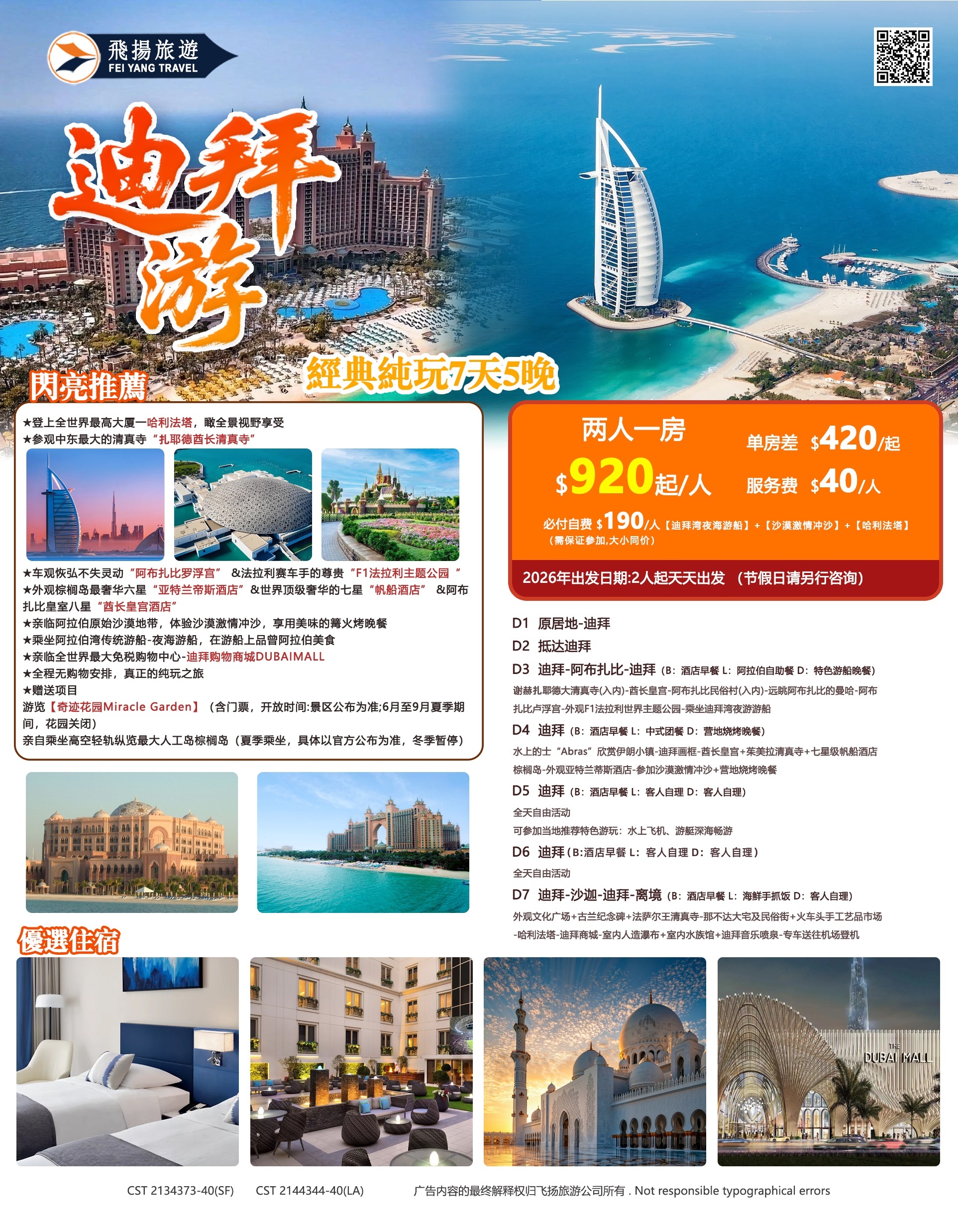 两人一房:$920起/人 单房差:$420起 小费:$40/人